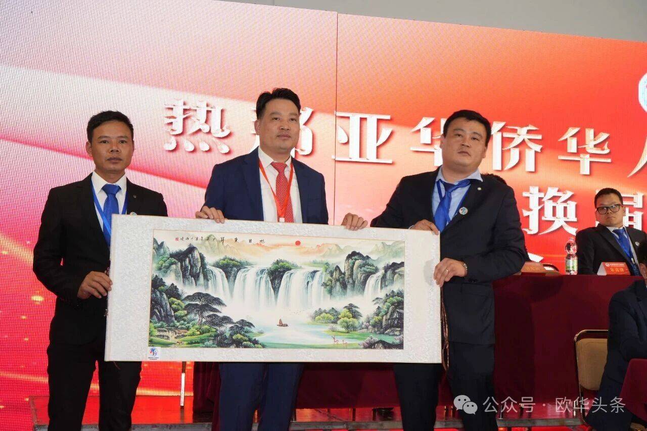 ▲会长助理陈晓杰与会务部部长叶苏荣向欧洲华侨华人社团联合会第二十一届大会主席蒋忠南赠送纪念品。