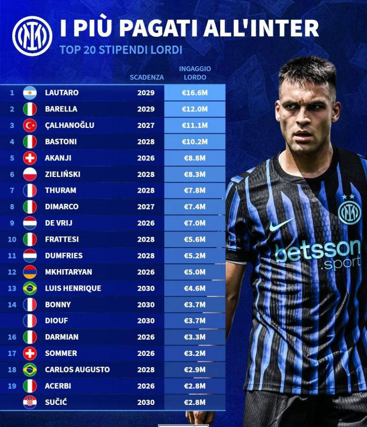 除了赛场之外,德国转会市场公布了国际米兰球员的税前年薪榜单。劳塔罗以1660万欧居高位列第一,巴雷拉和恰尔汗奥卢分别以1200万和1100万欧紧随其后。巴斯托尼拿着1020万欧,也位列前茅,阿坎吉年薪880万欧同样不可小觑。这份榜单展现了国米在薪资投入上的雄厚实力,也反映了球队核心球员的市场价值。