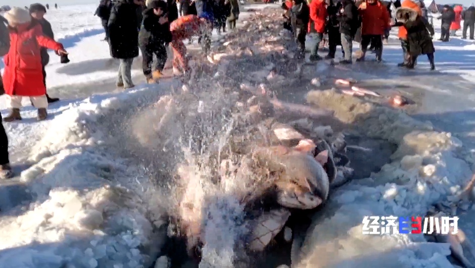 为了吸引游客,查干湖还推出捕鱼、冰下盲盒等新项目。100米长的挂网,游客组队拉拽,亲手捕鱼后,可以直接送进后厨做成铁锅炖。