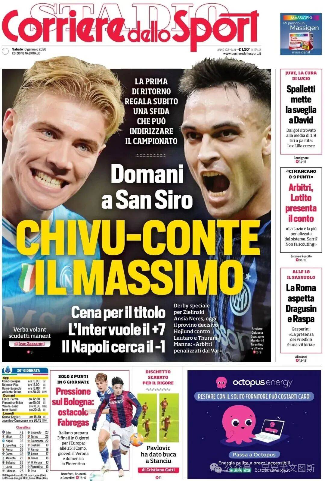 1、齐沃-孔蒂,巅峰对决。明天在圣西罗,这是一场可以解决本赛季两队问题的第一场决斗。冠军的晚餐:国米想要领先到7分,那不勒斯寻求追至只差1分。杰林斯基的特别德比,内雷斯令人焦虑,今天决定性的测试。霍伊伦德对抗图拉姆和劳塔罗,曼纳:“裁判受到了VAR的影响。”